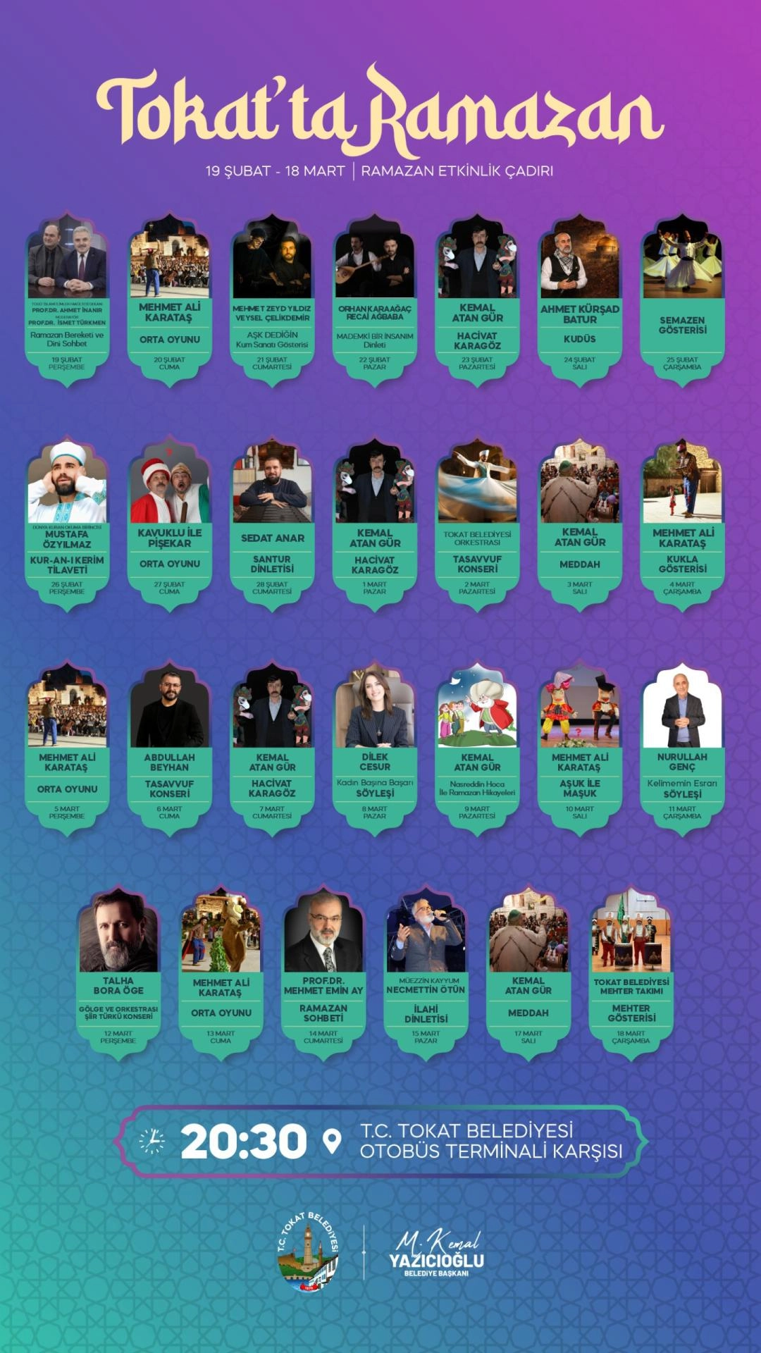 Tokat Belediyesi, 19 Şubat – 18 Mart tarihleri arasında düzenleyeceği “Tokat’ta Ramazan” programı ile kentte Ramazan ayını dolu dolu yaşatmaya hazırlanıyor. Terminal karşısında kurulacak Ramazan Etkinlik Çadırı’nda her akşam saat 20.30’da başlayacak kültürel ve manevi programlarla vatandaşlar bir araya gelecek. Aynı zamanda şehrin dört farklı noktasında kurulacak iftar sofralarında binlerce kişi aynı sofrada buluşacak.