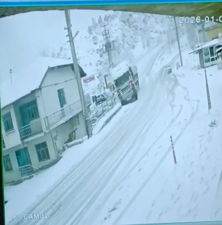 Fatih YILMAZ/ TOKAT, (DHA)- TOKAT'ın Reşadiye ilçesinde, sürücüsünün kontrolünden çıkan TIR'ın bir eve çarpma anı güvenlik kamerasına yansıdı.